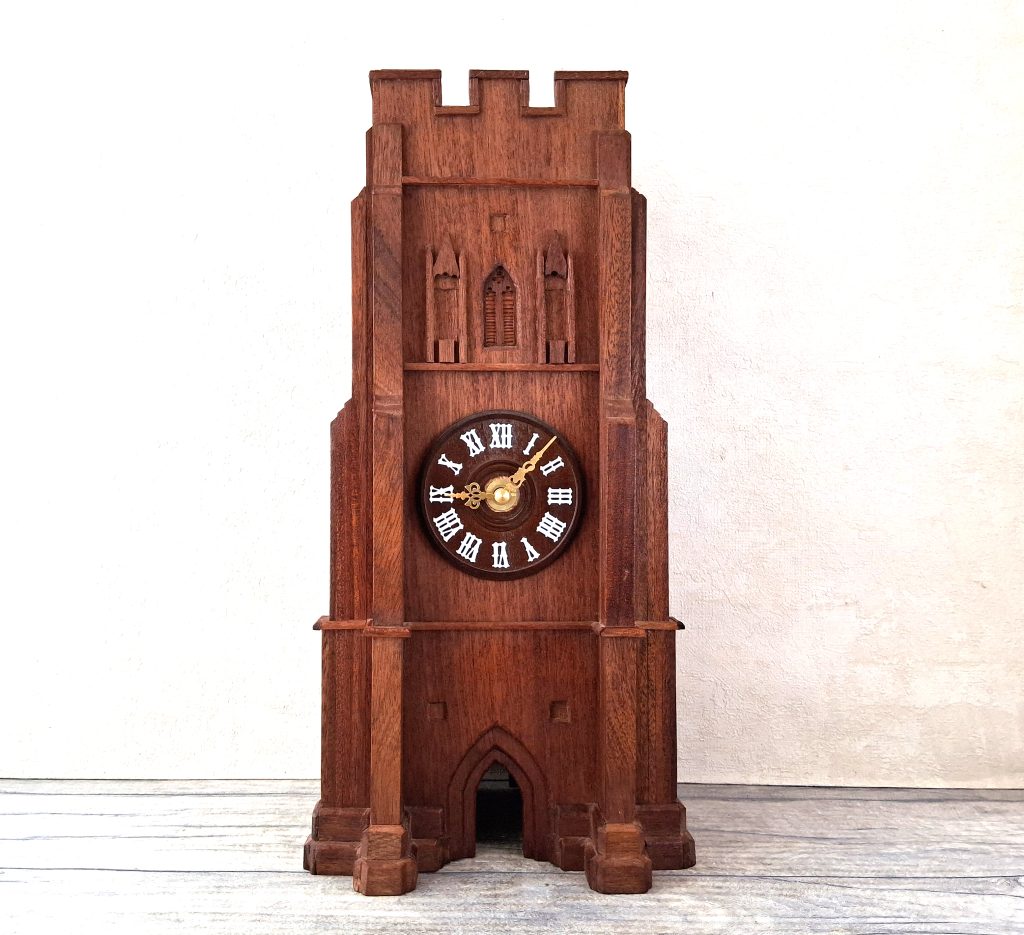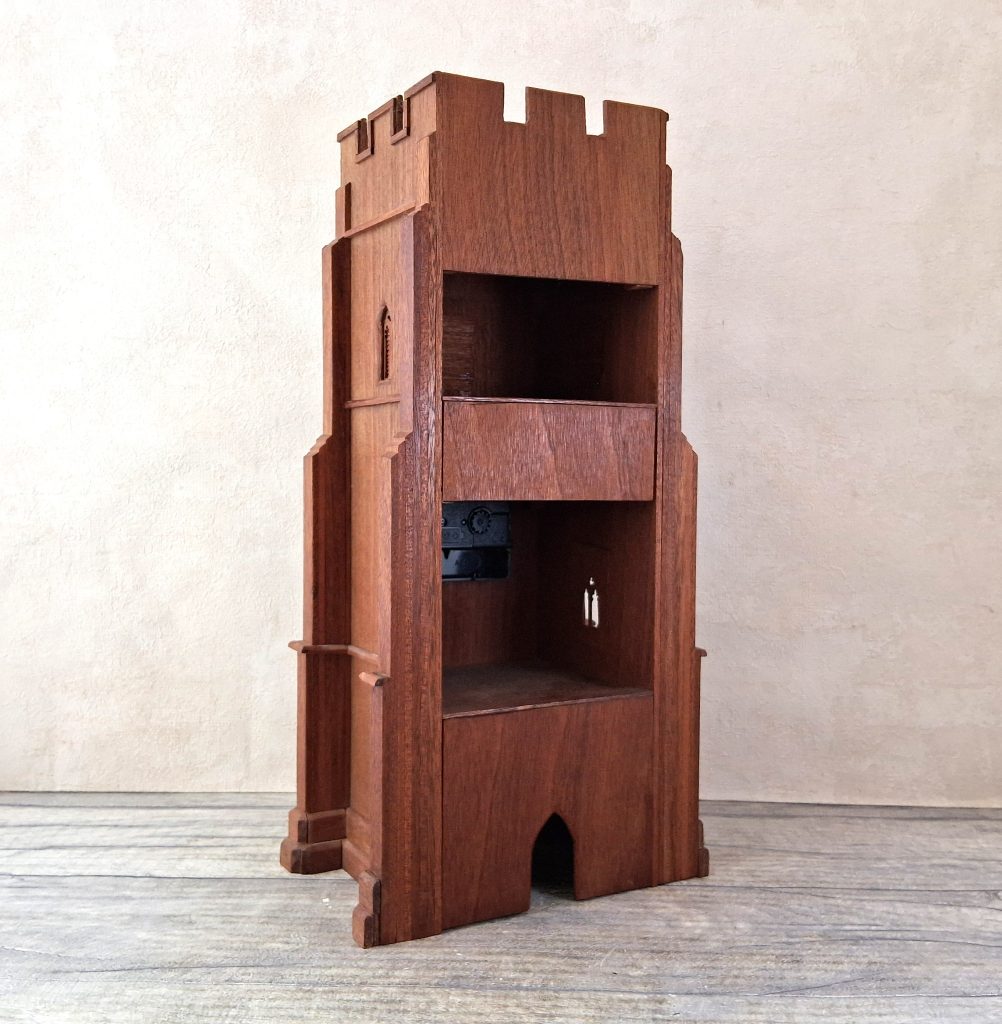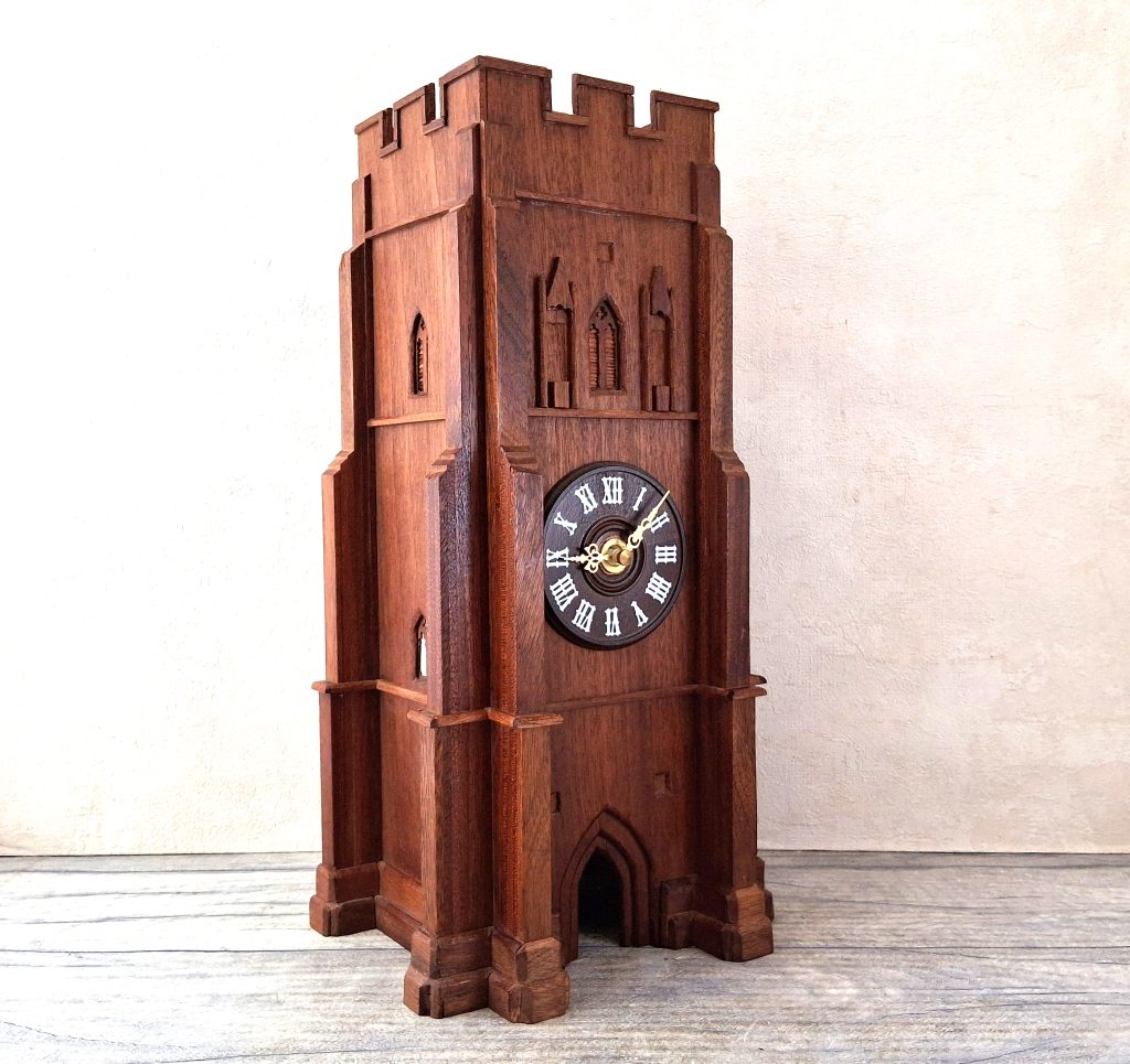 This is made in solid mahogany. We had to omit some of the front niches in favour of the clock dial, but the overall iconic look of the tower is preserved. The windows have been given tracery, and the upper ones have the louvres, behind which the bells would have once tolled across the Somerset levels.